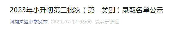 浙江台州回浦实验中学2023年小升初第二批次(第一类别)录取名单公示07-15