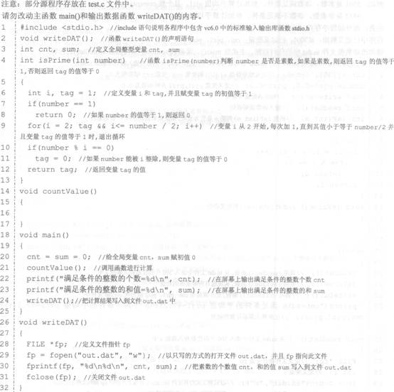 程序test.c的功能是:计算100以内满足以下条件的所有整数i的个数cnt以及这些i之和sum。条件:i,i+4,i+10都是素数,同时i+10小于100。请考生编写函数countvalue()实现程序要求,最后调用函数wfiteDAT()把结果cnt和sum输出到文件out.dat中。(数值l不是素数)