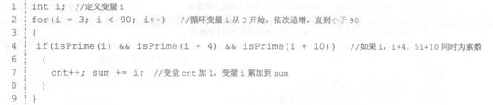 ②在for循环中,每执行一次循环则调用函数isPrime()(该函数具体的算法已经在源程序中给出,直接用即可),对i、 i+4、i+10是否同时是素数进行判断,如果这三个数同时为素数,则计数变量cnt值加1,同将时将变量i的值累加到sum上。