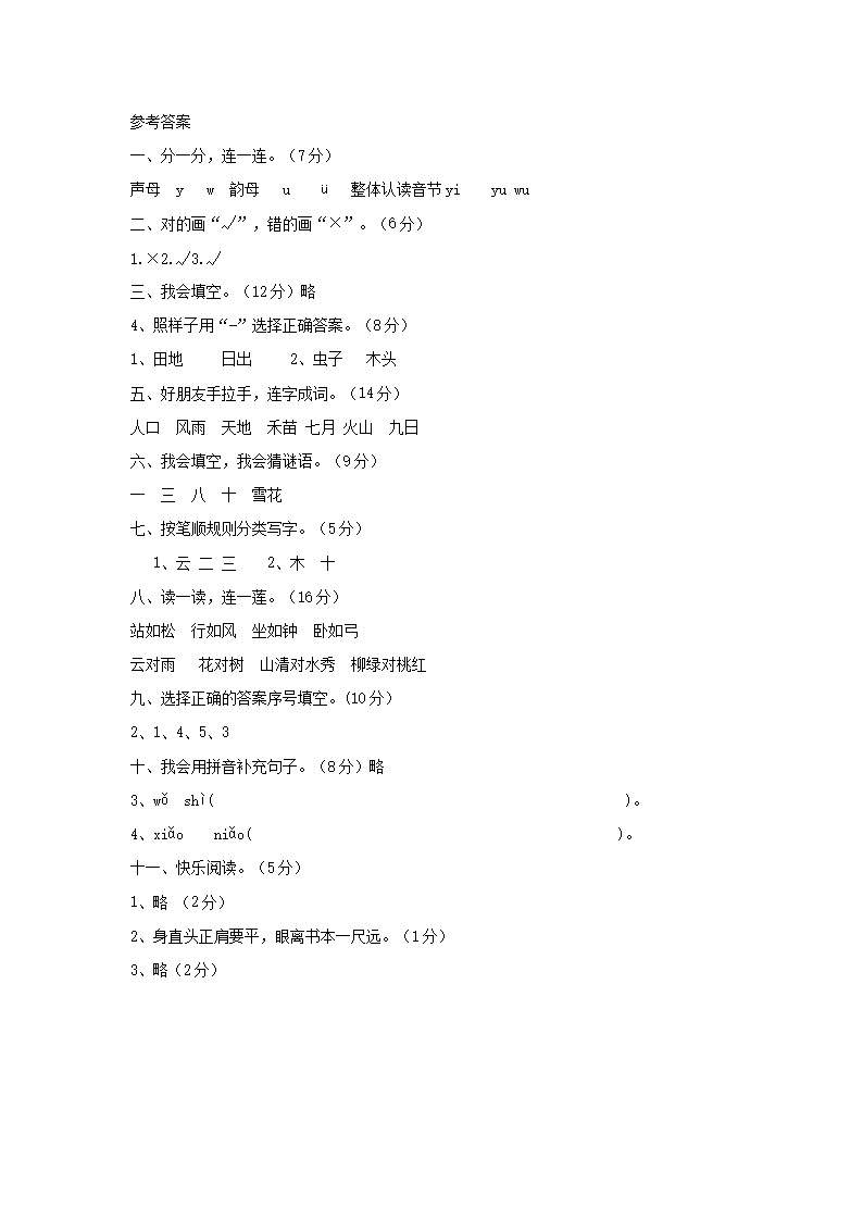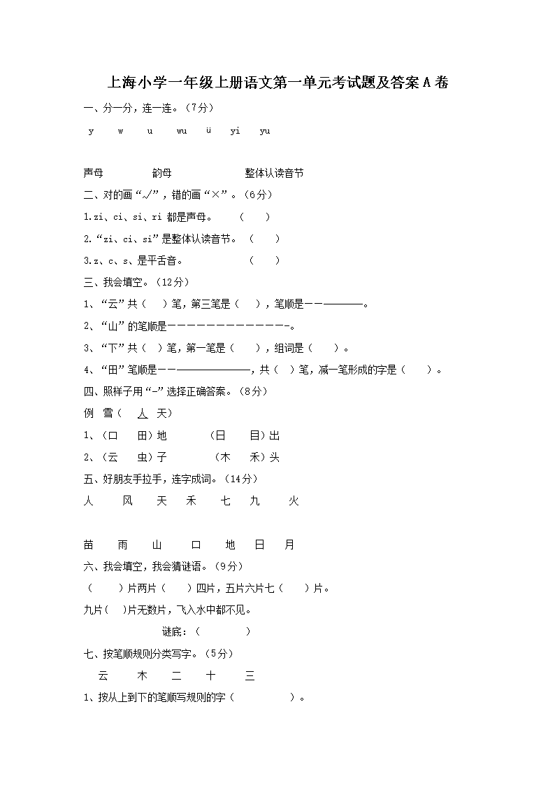 上海小学一年级上册语文第一单元考试题及答案A卷(Word版)10-25