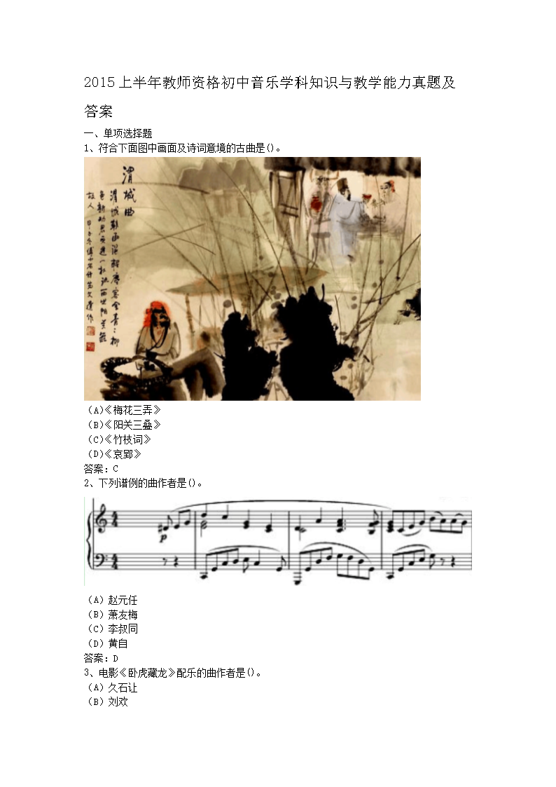 2015上半年教师资格初中音乐学科知识与教学能力真题及答案(Word版)09-01