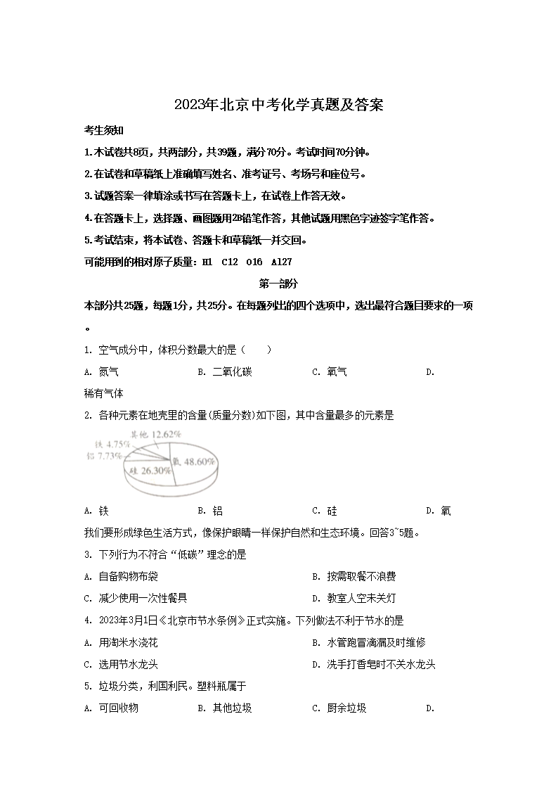 【文档预览】 文档大全网整理发布2023年北京中考化学真题及答案(Word版),前五页预览如下: