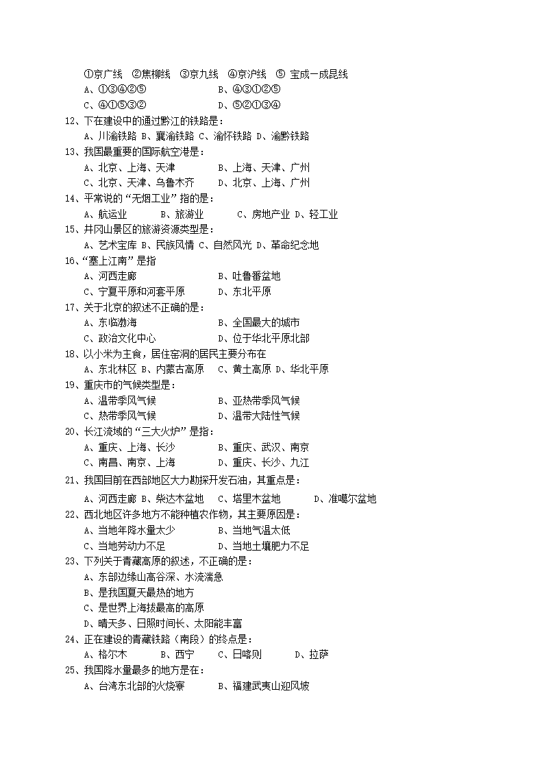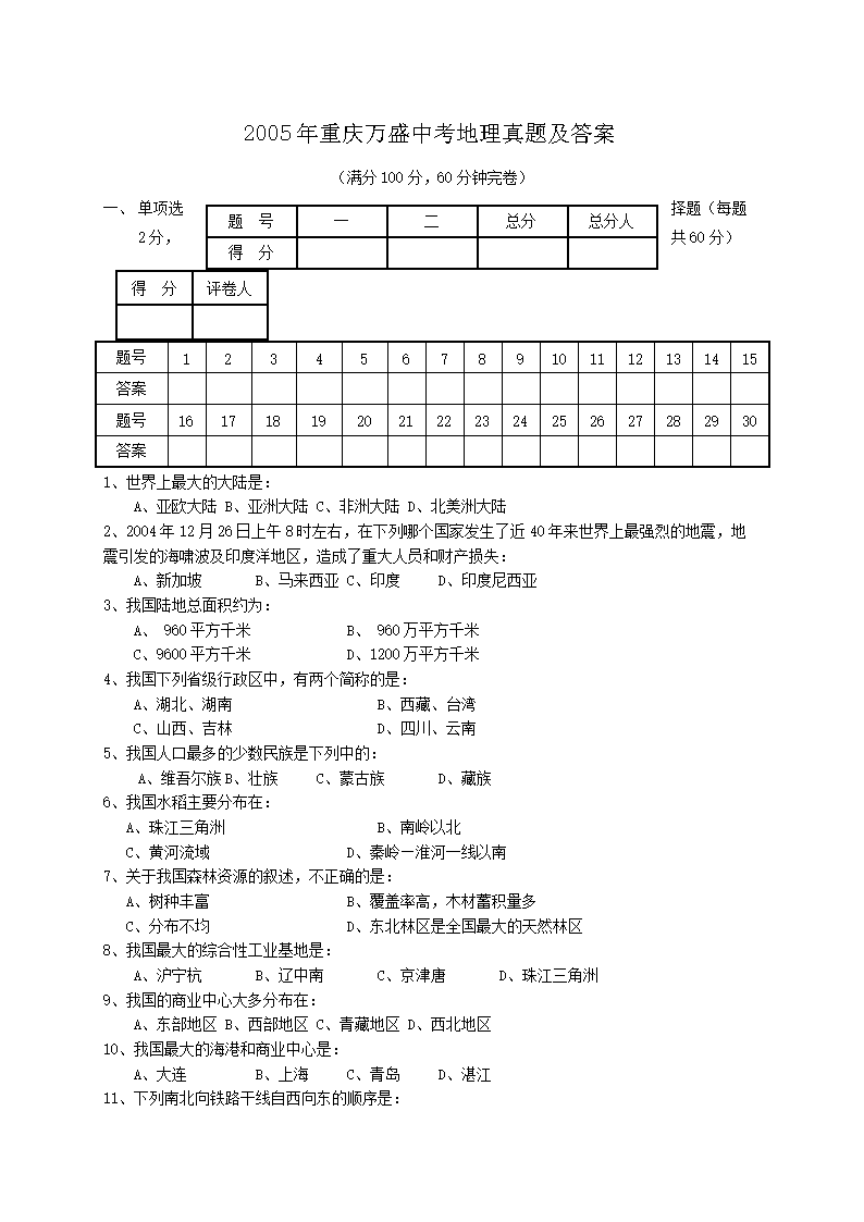 2005年重庆万盛中考地理真题及答案(Word版)06-03