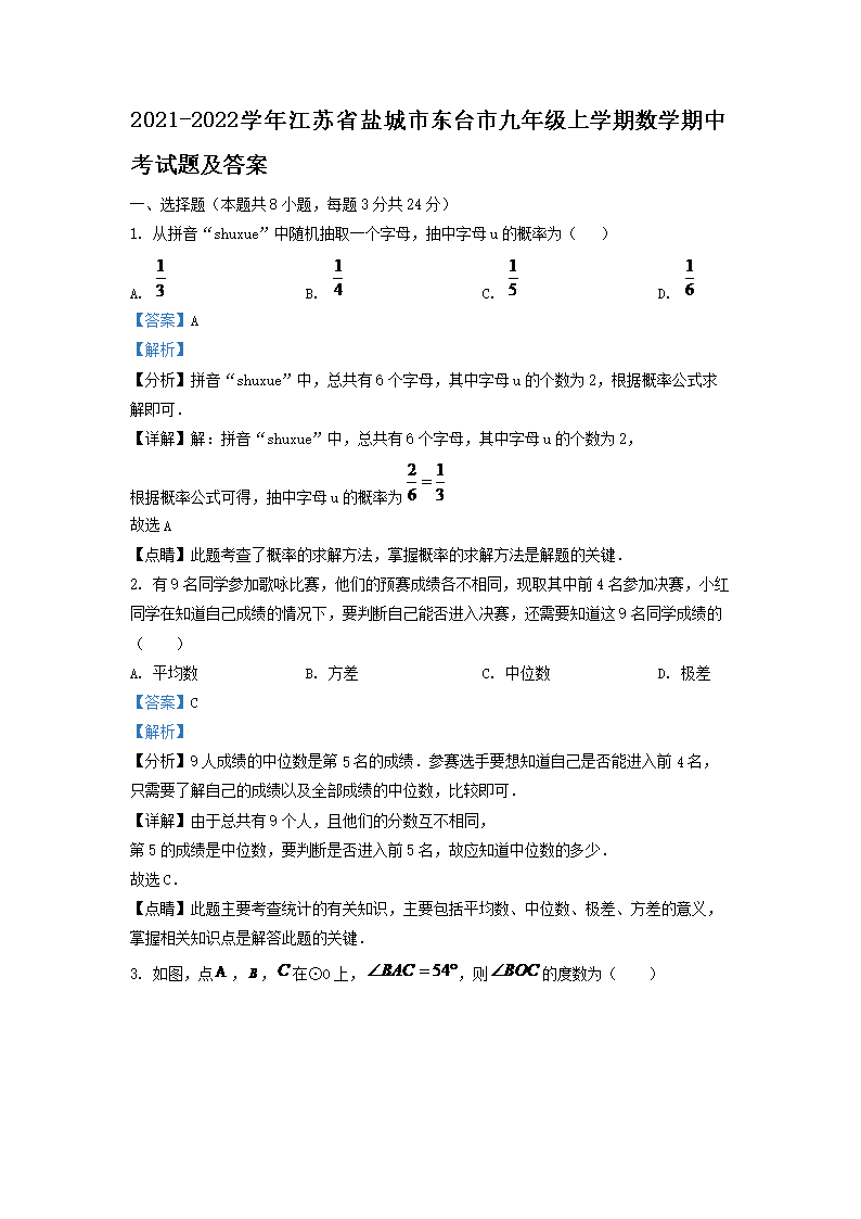 【文档预览】 文档大全网整理发布2021-2022学年江苏省盐城市东台市九年级上学期数学期中考试题及答案(Word版),前五页预览如下: