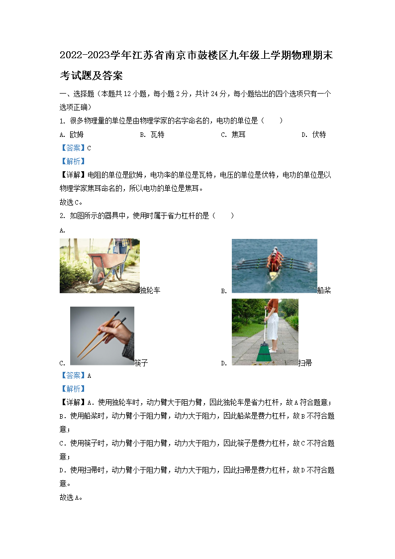 2022-2023学年江苏省南京市鼓楼区九年级上学期物理期末考试题及答案(Word版)10-12