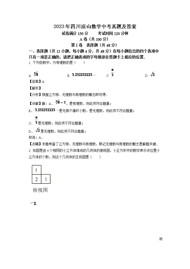 【文档预览】 文档大全网整理发布2023年四川凉山数学中考真题及答案(Word版),前五页预览如下:
