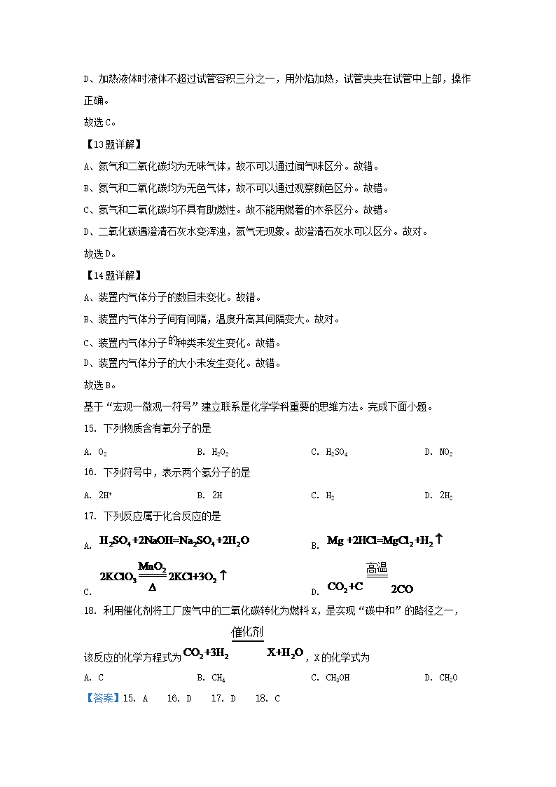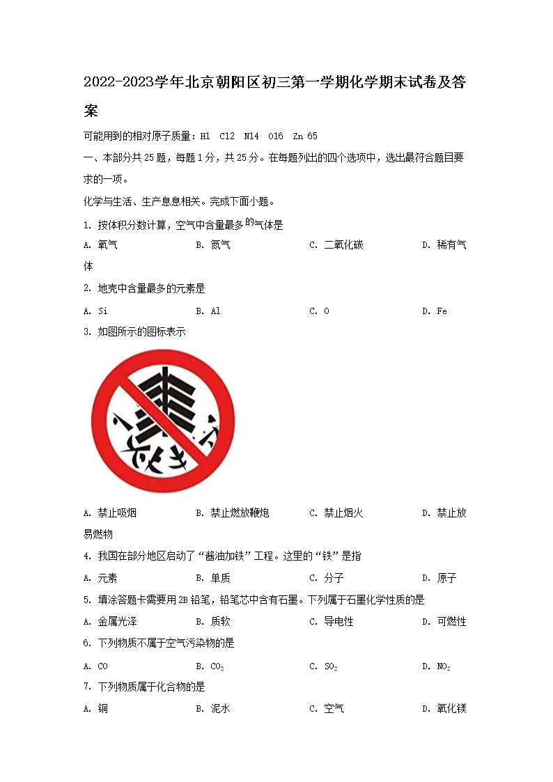 2022-2023学年北京朝阳区初三第一学期化学期末试卷及答案(Word版)08-03