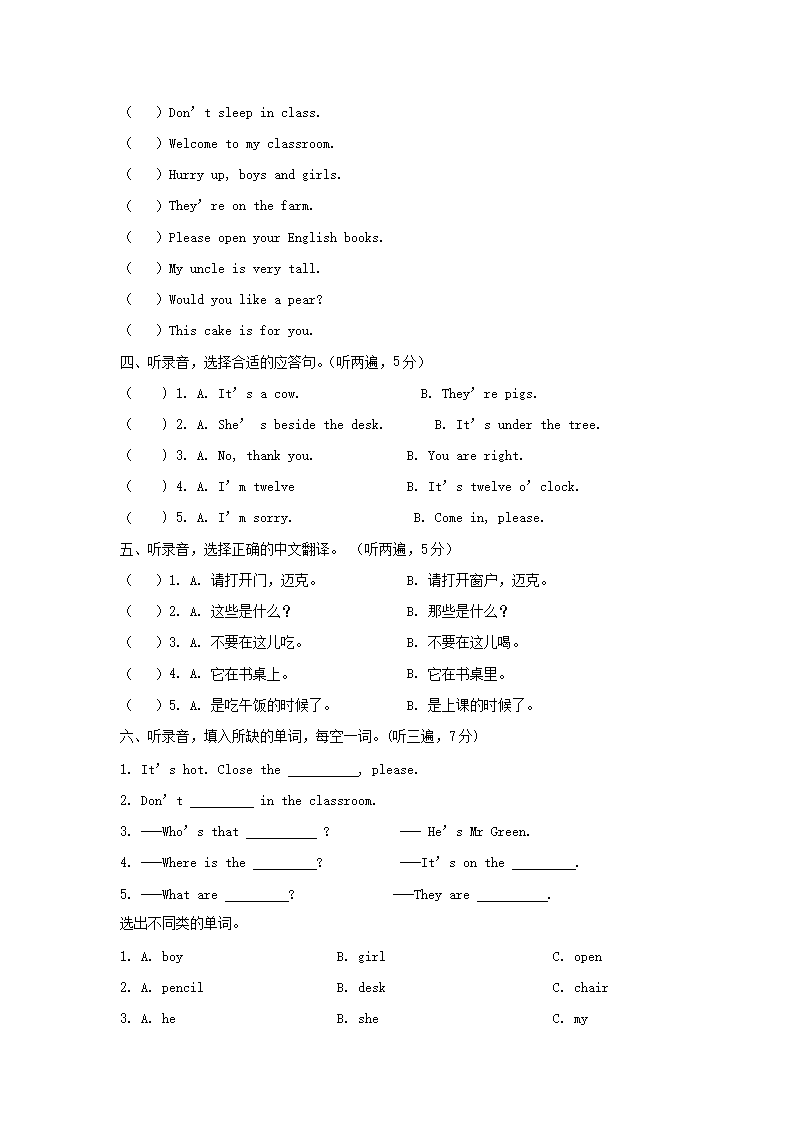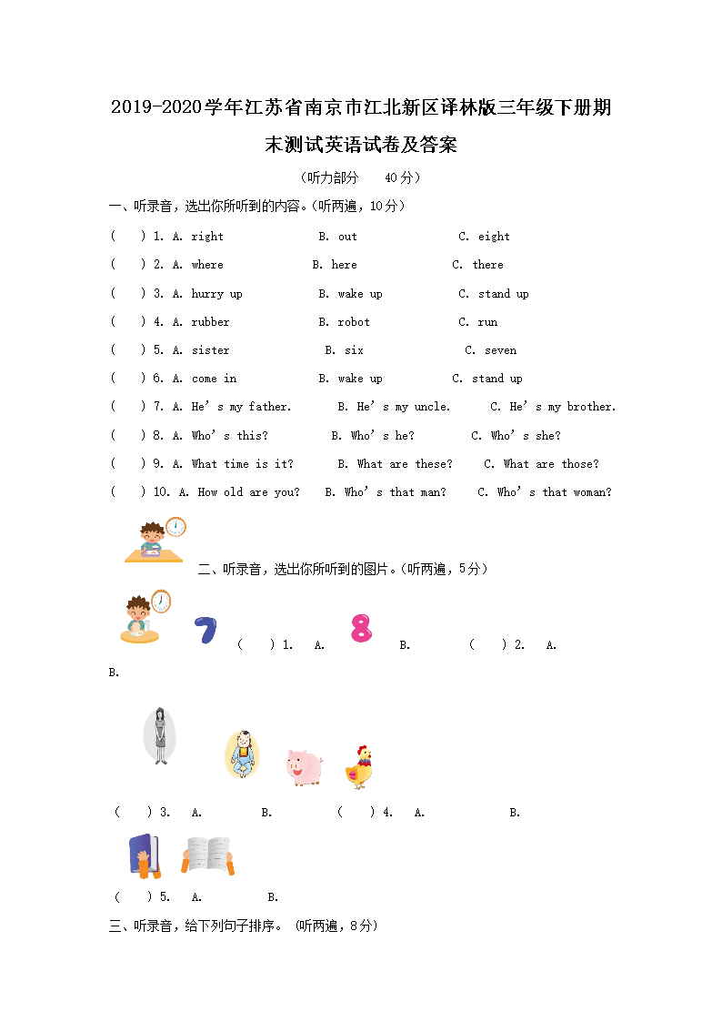 2019-2020学年江苏省南京市江北新区译林版三年级下册期末测试英语试卷及答案(Word版)08-05