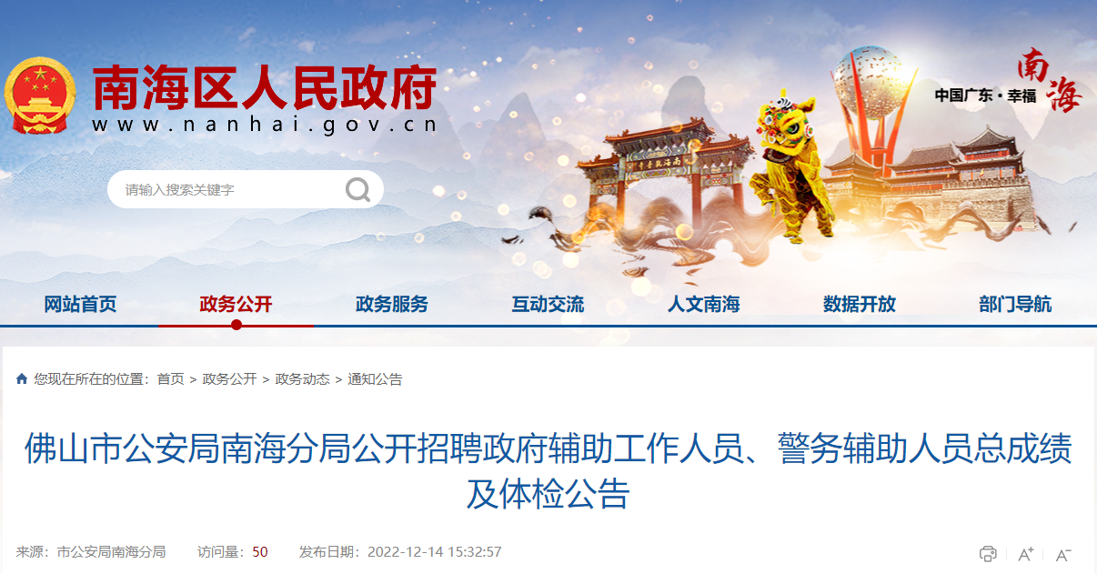 2022年广东佛山市公安局南海分局招聘政府辅助人员、警务辅助人员总成绩及体检公告12-16