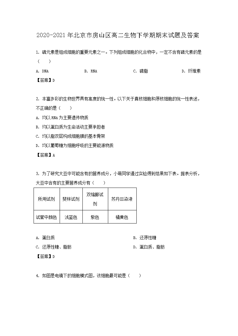 2020-2021年北京市房山区高二生物下学期期末试题及答案(Word版)09-28
