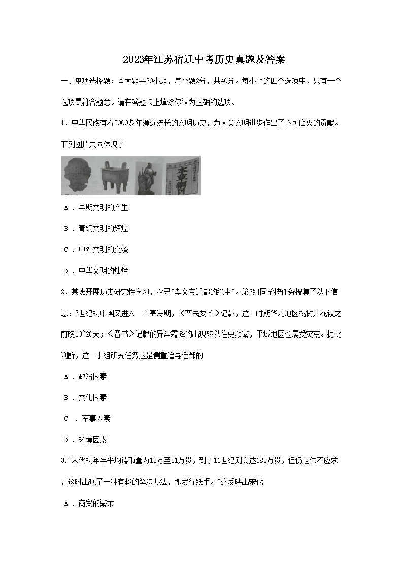 【文档预览】 文档大全网整理发布2023年江苏宿迁中考历史真题及答案(Word版),前五页预览如下:
