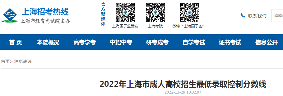 原文标题:2022年上海市成人高校招生最低录取控制分数线