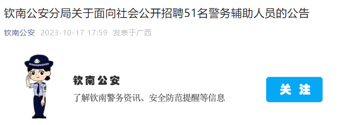 【#招警考试# #2023年广西钦州钦南公安分局招聘警务辅助人员公告(51人)#】©文档大全网从钦南公安了解到,2023年广西钦州钦南公安分局招聘警务辅助人员51人,相关事宜详情如下: