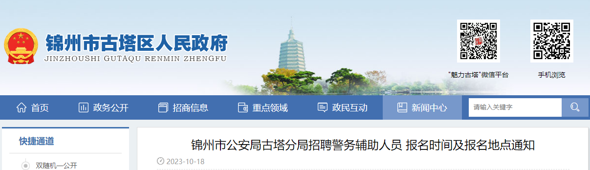 【#招警考试# #2023年辽宁锦州市公安局古塔分局招聘警务辅助人员报名时间及报名地点通知#】®文档大全网从古塔区人民政府了解到,2023年辽宁锦州市公安局古塔分局招聘警务辅助人员报名时间及报名地点现已公布,相关事宜详情如下: