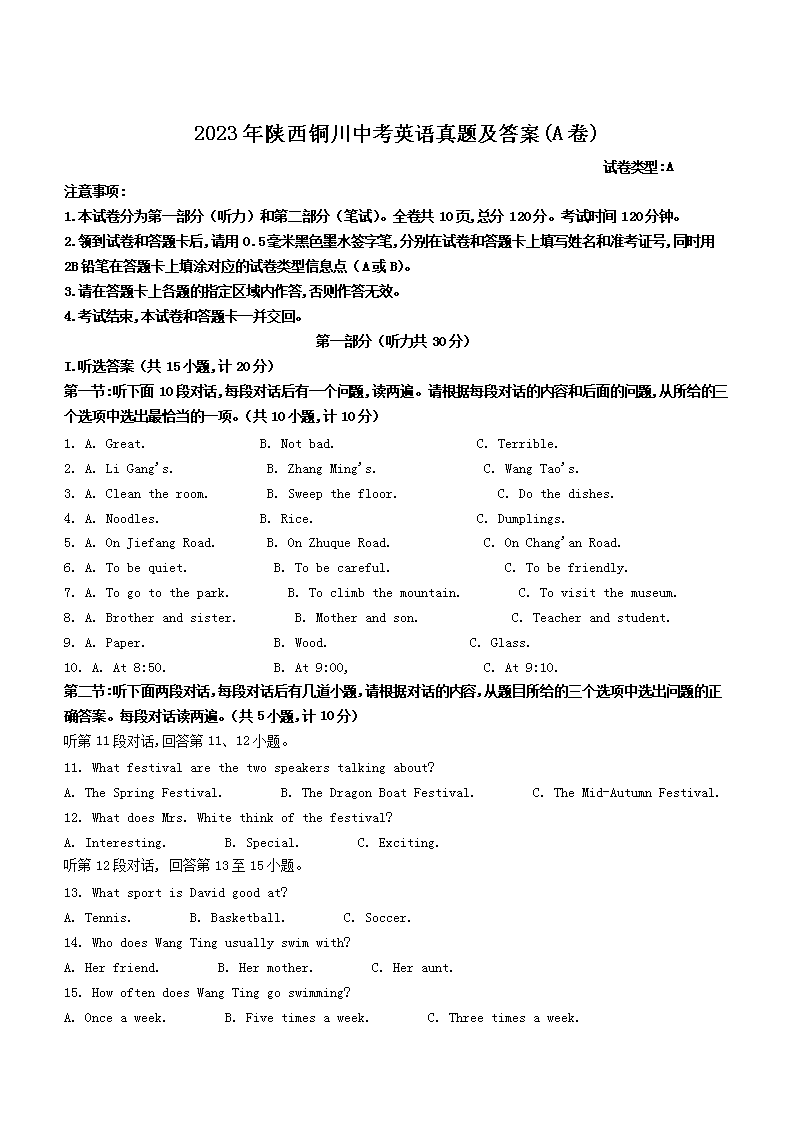2023年陕西铜川中考英语真题及答案(A卷)(Word版)06-21