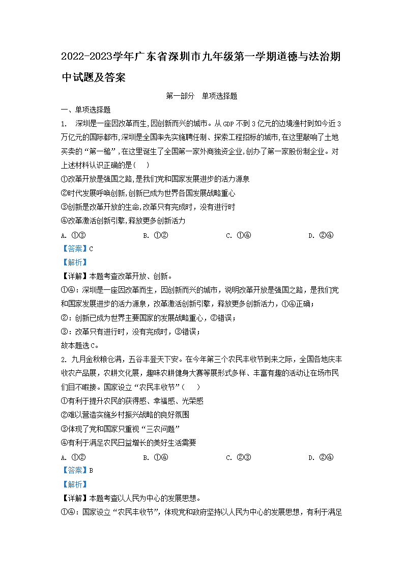 2022-2023学年广东省深圳市九年级第一学期道德与法治期中试题及答案(Word版)08-22