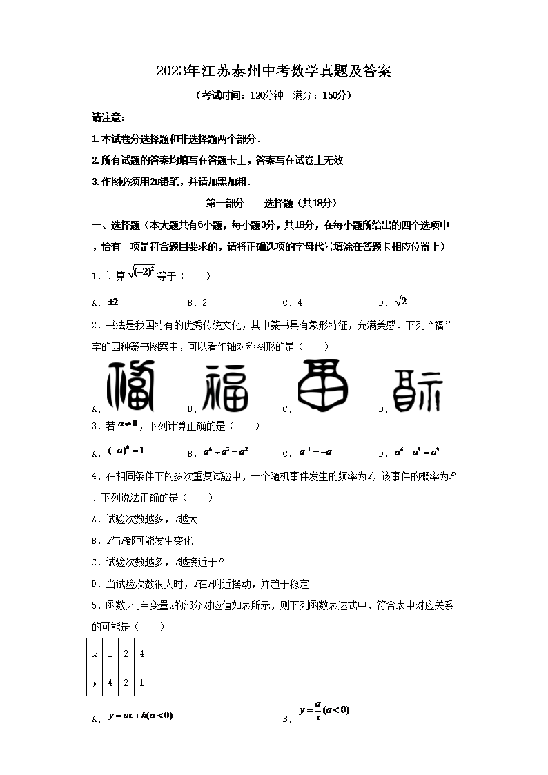 2023年江苏泰州中考数学真题及答案(Word版)10-21