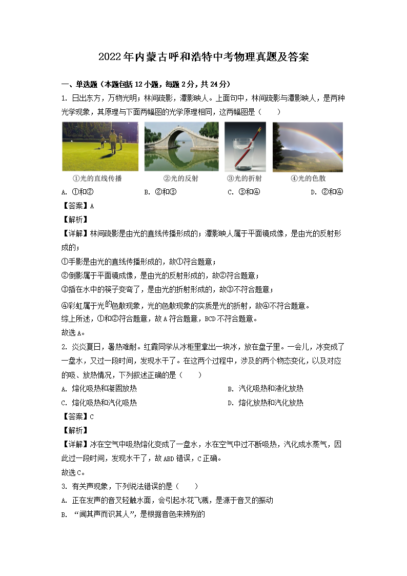 2022年内蒙古呼和浩特中考物理真题及答案(Word版)06-03