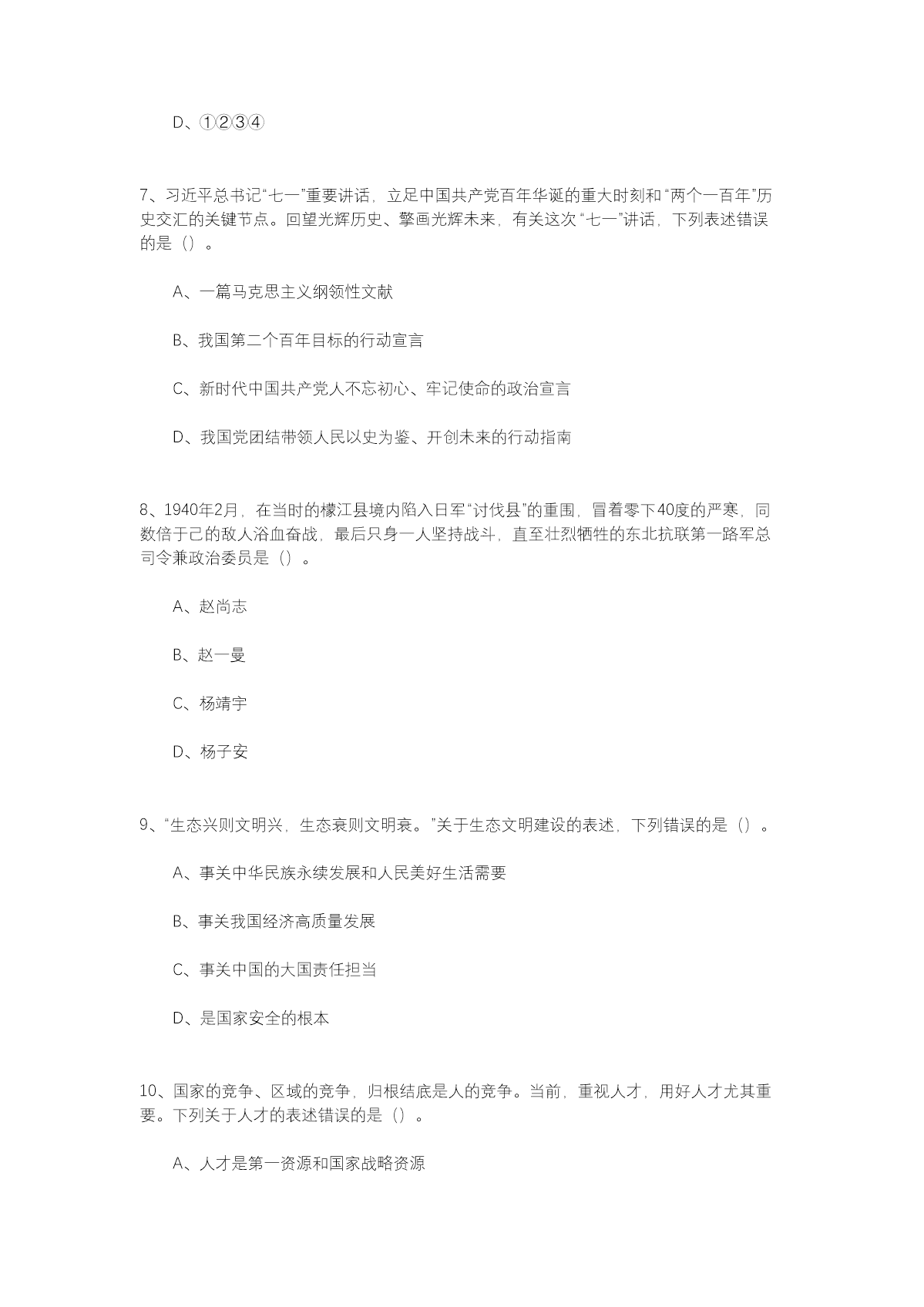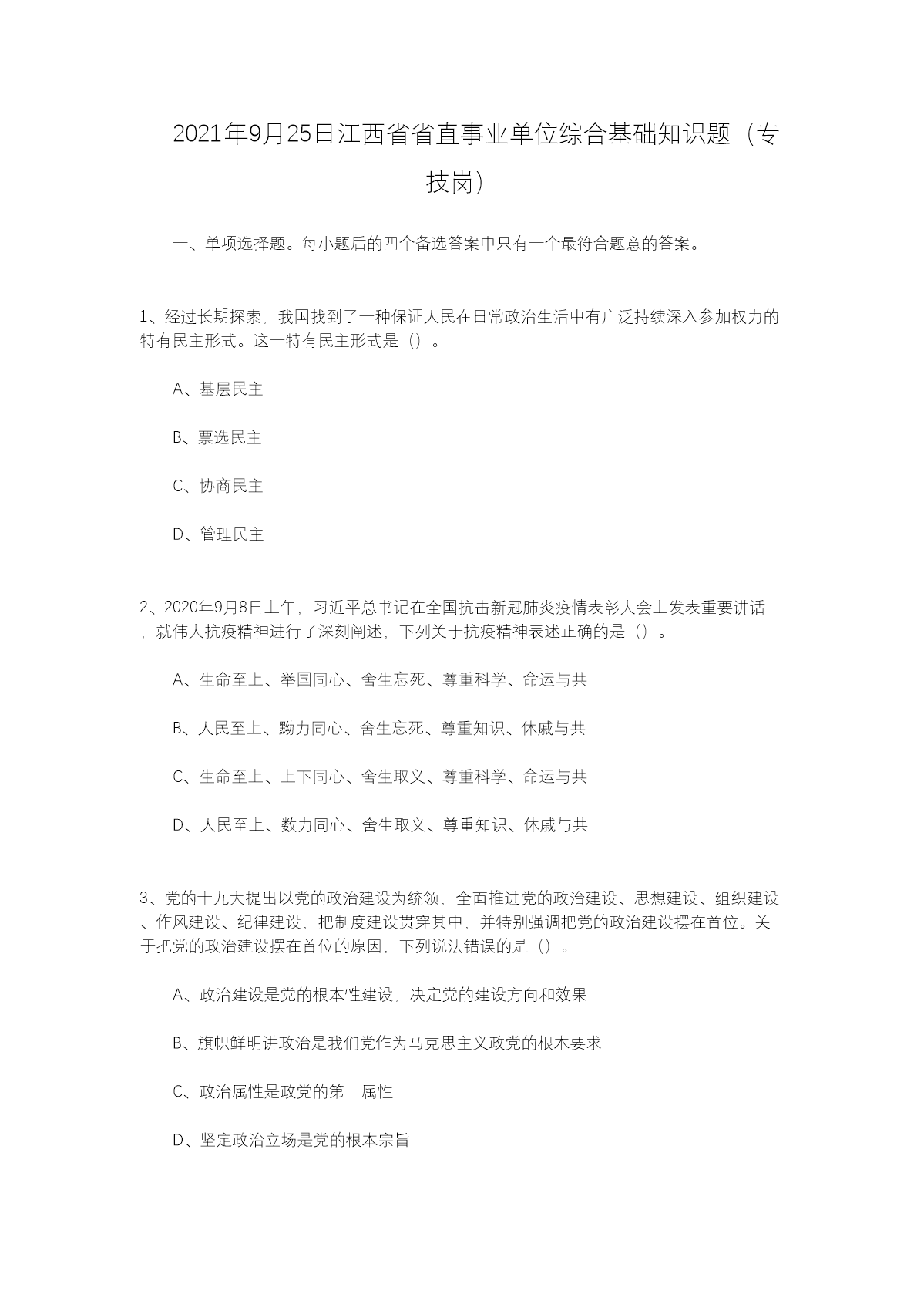 2021年9月25日江西省省直事业单位综合基础知识题专技岗(Word版)10-25