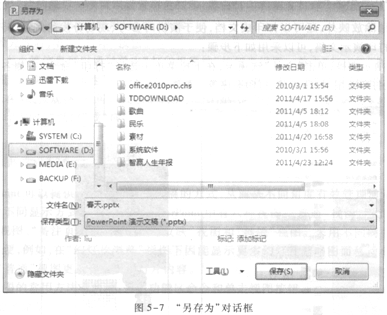 (1)演示文稿制作完成后,通常保存演示文稿的方法是单击快速访问工具栏的“保存”按钮 (也可以单击“文件”选项卡,在下拉菜单中选择“保存”命令),若是第一次保存,将出现如图5—7所示的“另存为”对话框。否则不会出现该对话框,直接按原路径及文件名存盘。