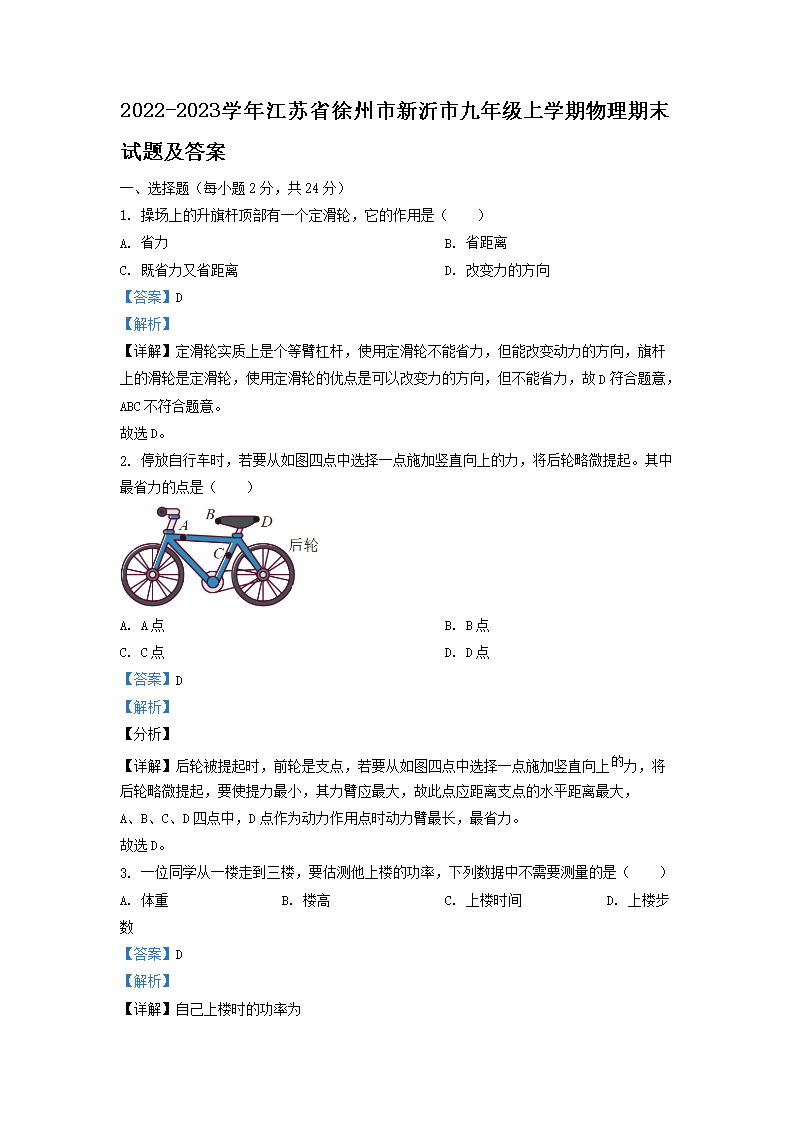 2022-2023学年江苏省徐州市新沂市九年级上学期物理期末试题及答案(Word版)10-14