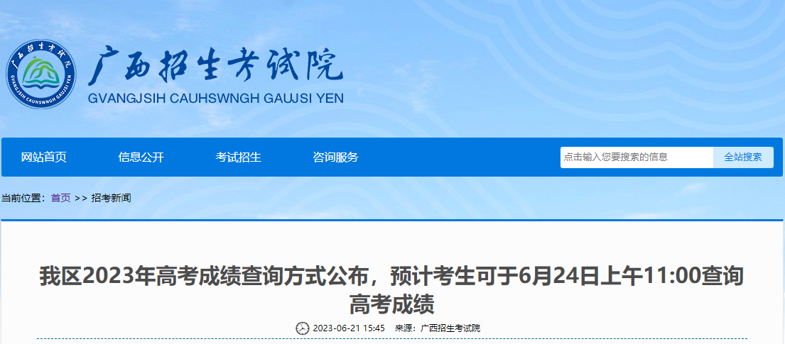预计6月24日上午11:00起,考生可通过网站查询、短信查询、“智桂通”查询等3种方式免费查询高考成绩信息(含加分信息)。