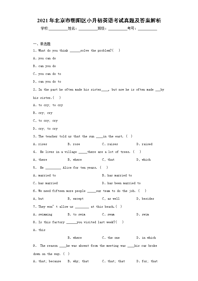 2021年北京市朝阳区小升初英语考试真题及答案解析(Word版)06-01