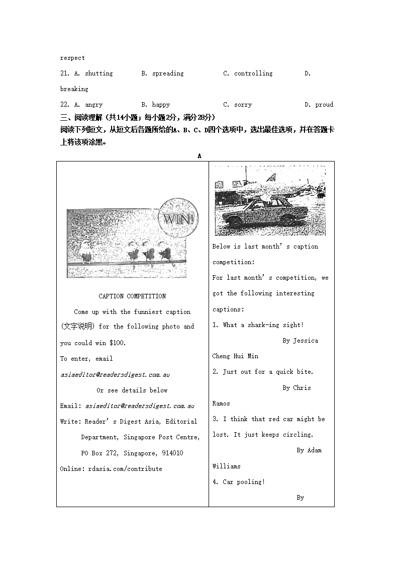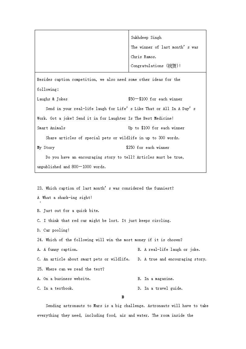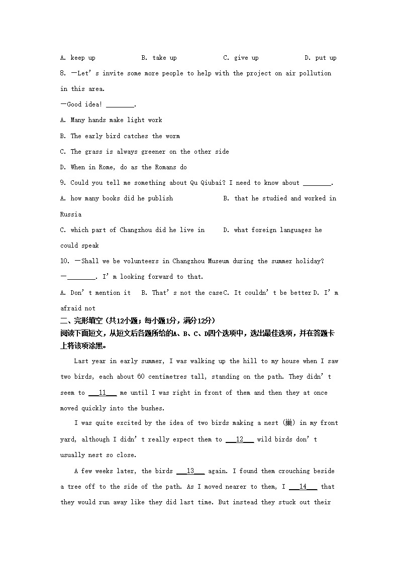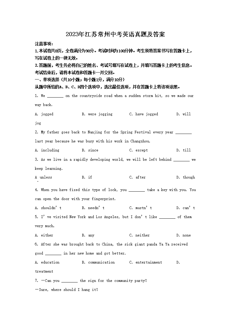 2023年江苏常州中考英语真题及答案(Word版)09-28