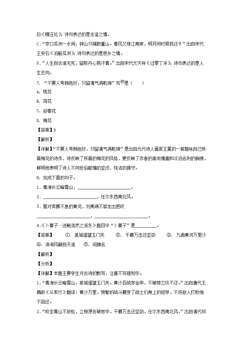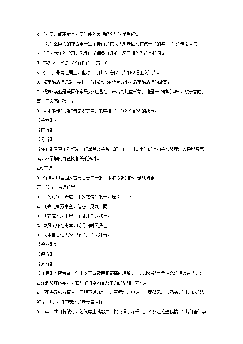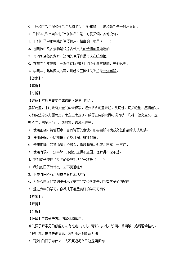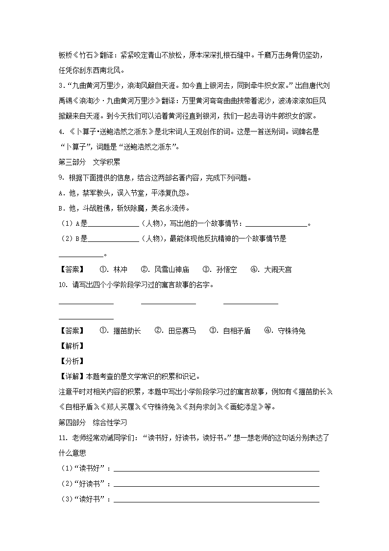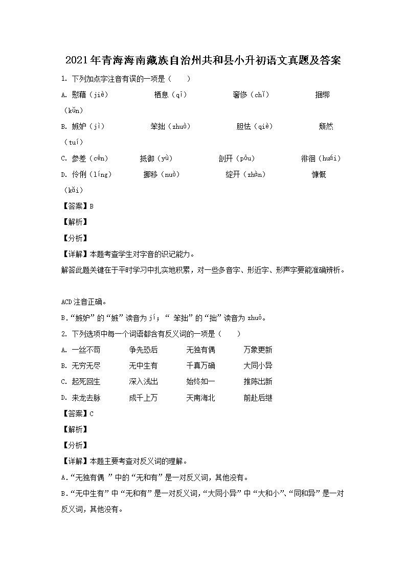 2021年青海海南藏族自治州共和县小升初语文真题及答案(Word版)10-20