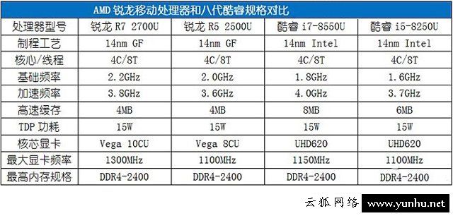 锐龙移动处理器主打能耗比,首发的锐龙R7 2700U和锐龙R52500U只有15W TDP功耗,所以它们的竞争对手显然不是搭载45W TDP的H系列酷睿处理器(如i5-7300HQ),也就是说它们与游戏本基本“绝缘”。