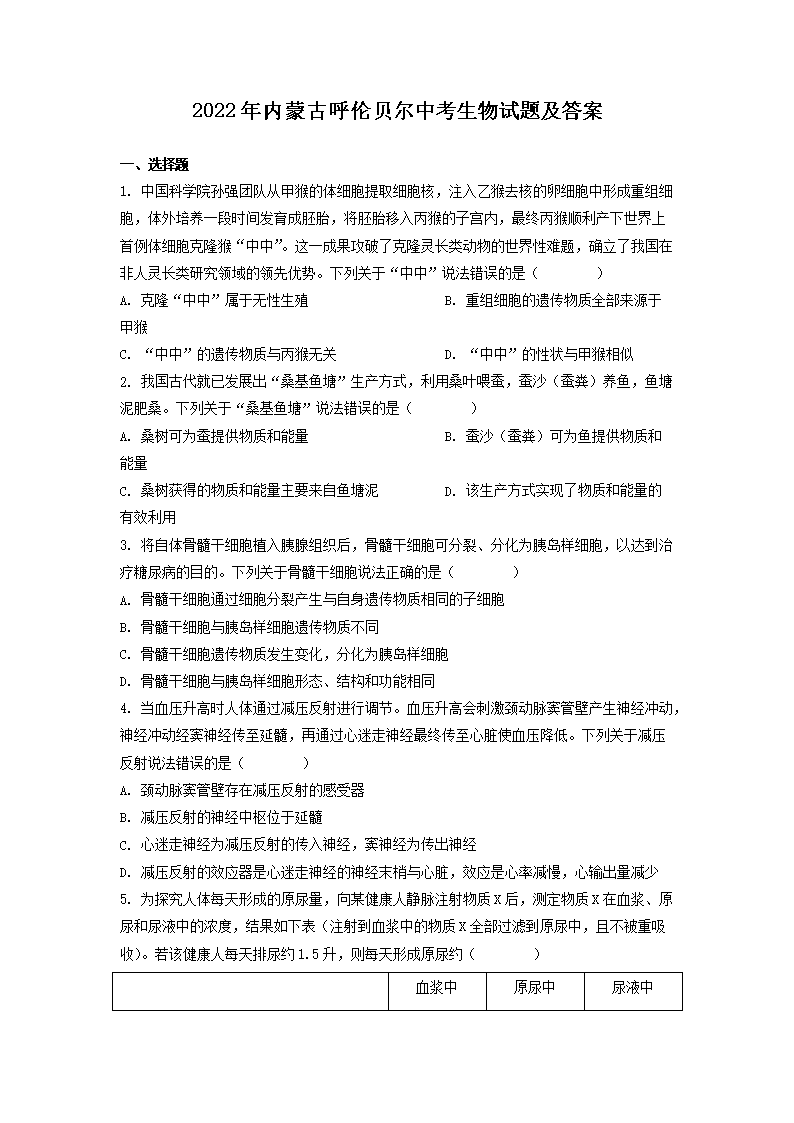 2022年内蒙古呼伦贝尔中考生物试题及答案(Word版)06-03