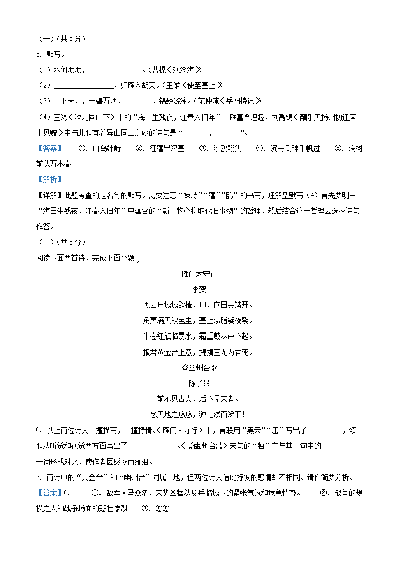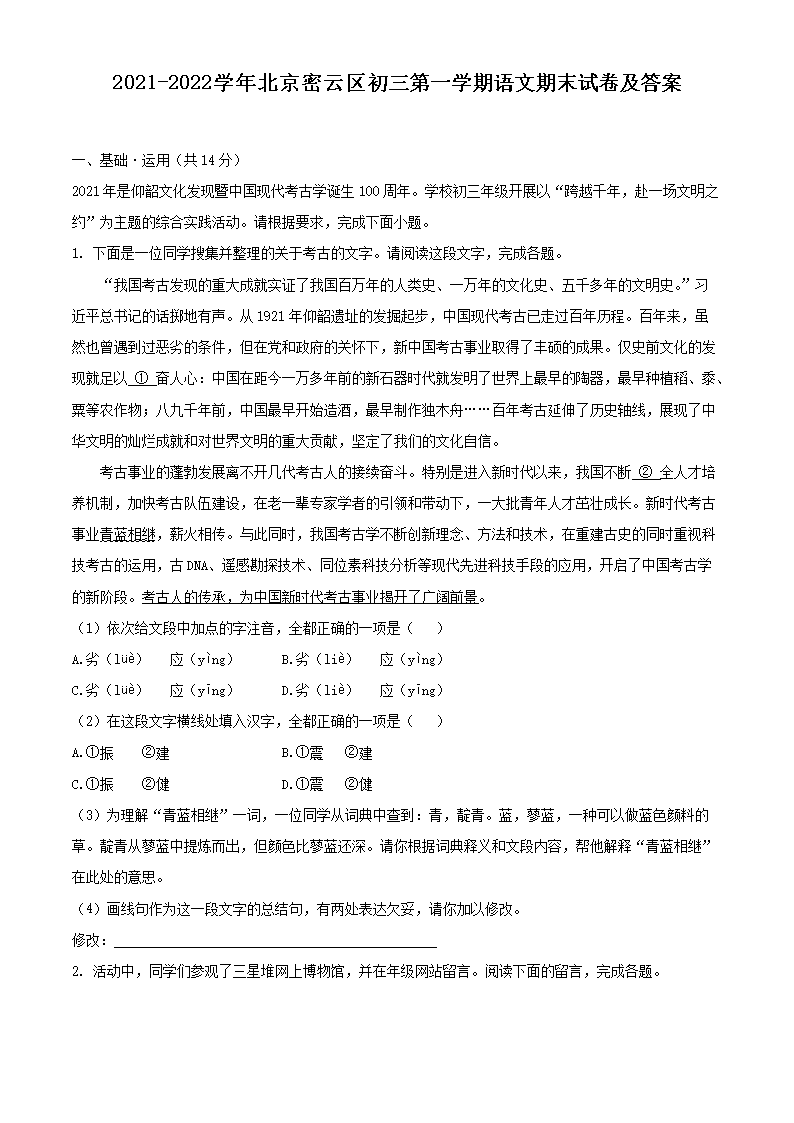 2021-2022学年北京密云区初三第一学期语文期末试卷及答案(Word版)06-30