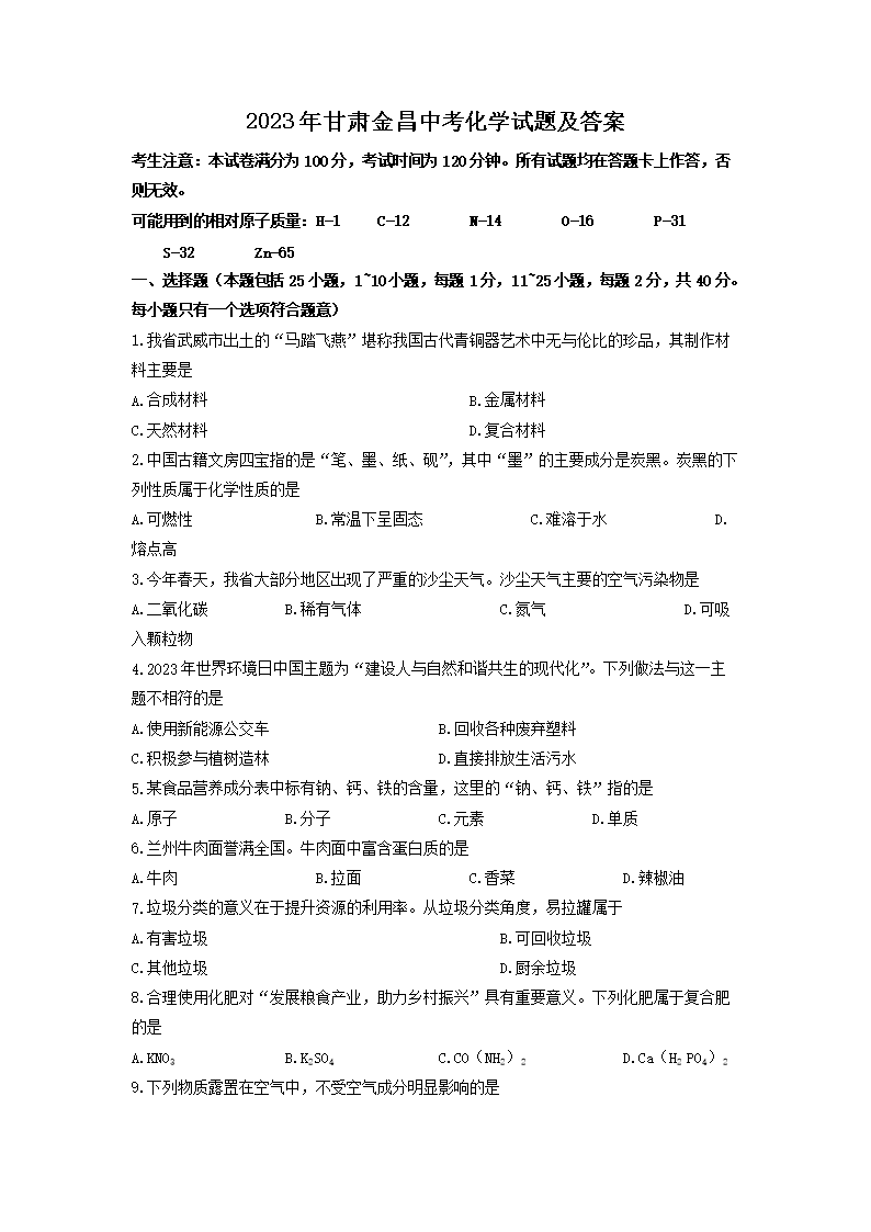 2023年甘肃金昌中考化学试题及答案(Word版)06-29