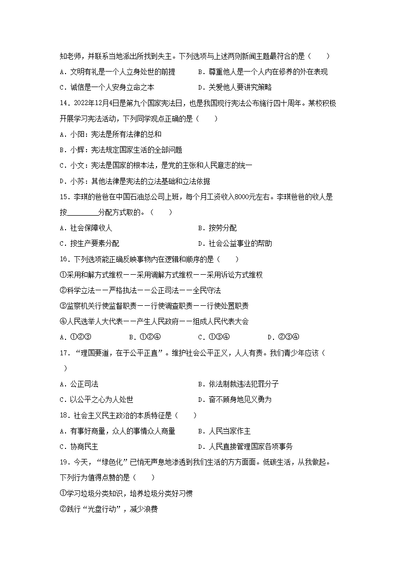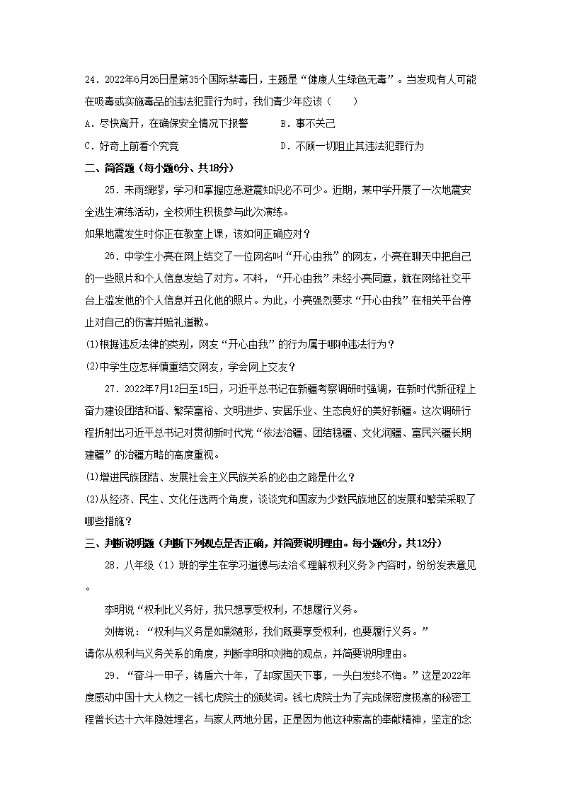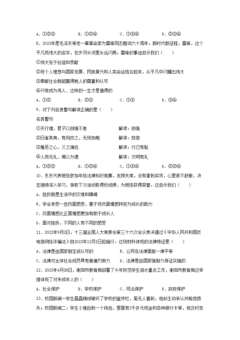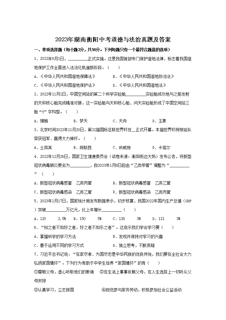 2023年湖南衡阳中考道德与法治真题及答案(Word版)07-07