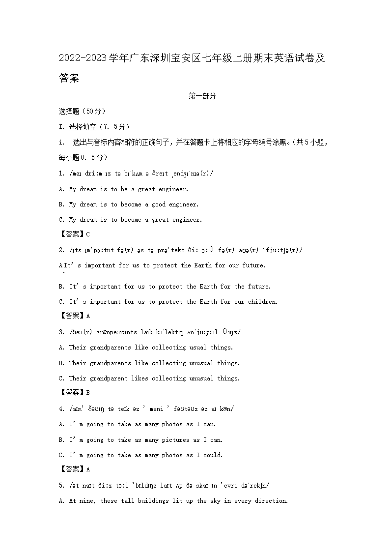 2022-2023学年广东深圳宝安区七年级上册期末英语试卷及答案(Word版)09-26