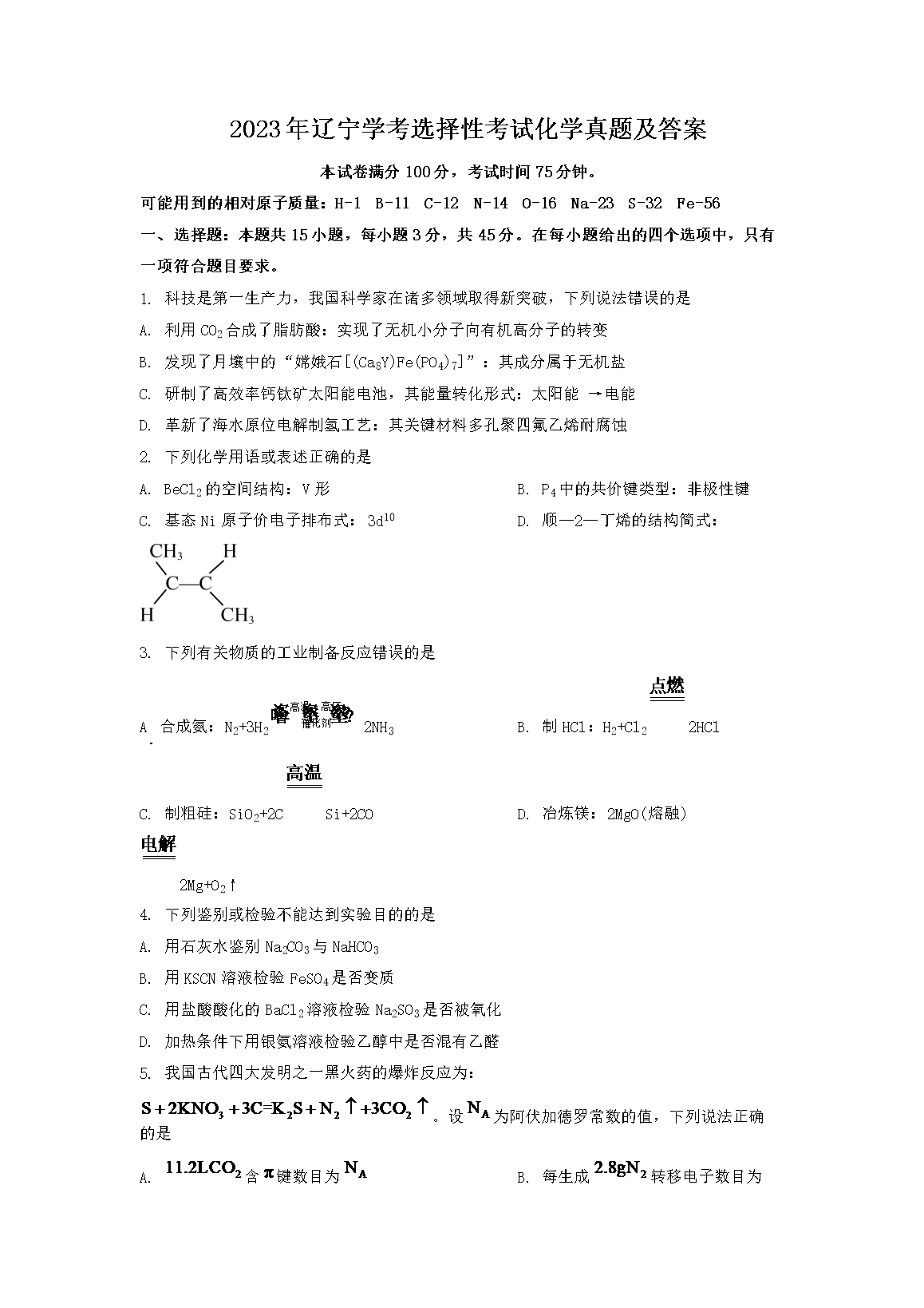 2023年辽宁学考选择性考试化学真题及答案(Word版)06-19