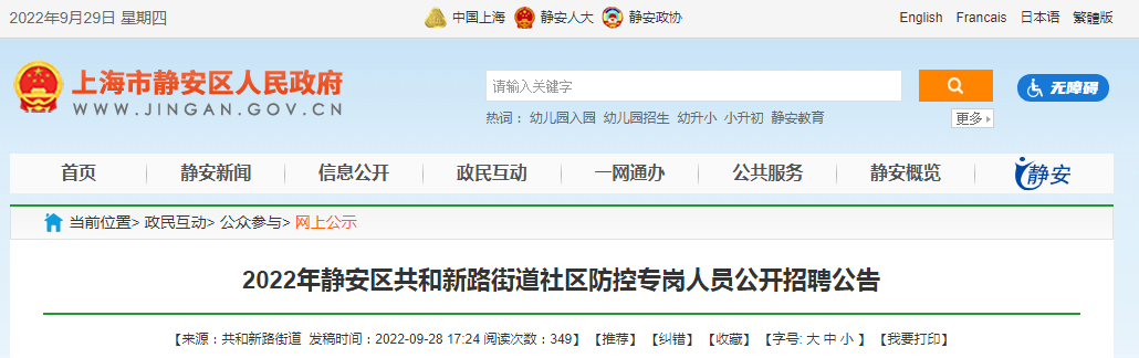 2022年上海市静安区共和新路街道社区防控专岗人员公开招聘公告09-30