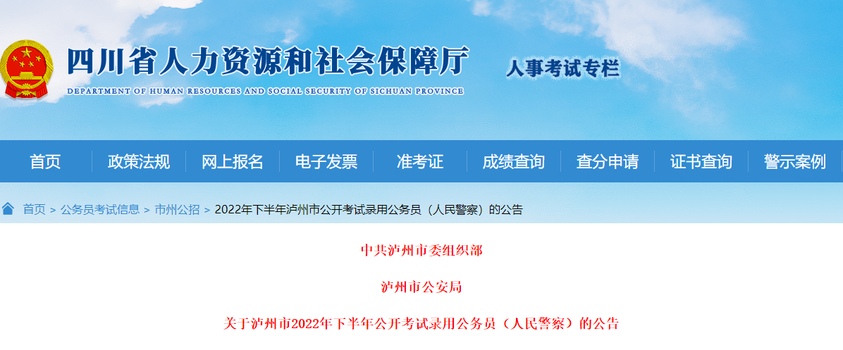 原文标题:关于泸州市2022年下半年公开考试录用公务员(人民警察)的公告