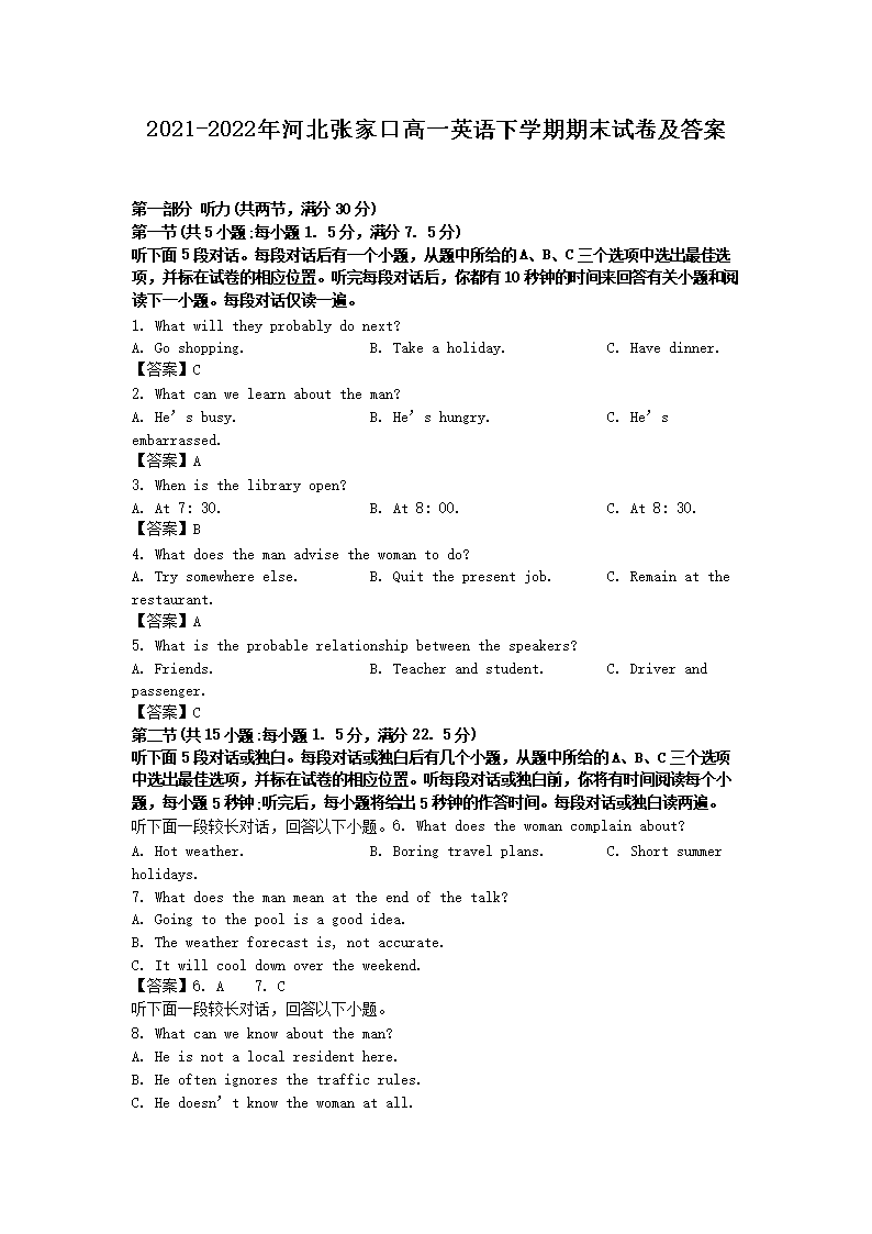 2021-2022年河北张家口高一英语下学期期末试卷及答案(Word版)09-28