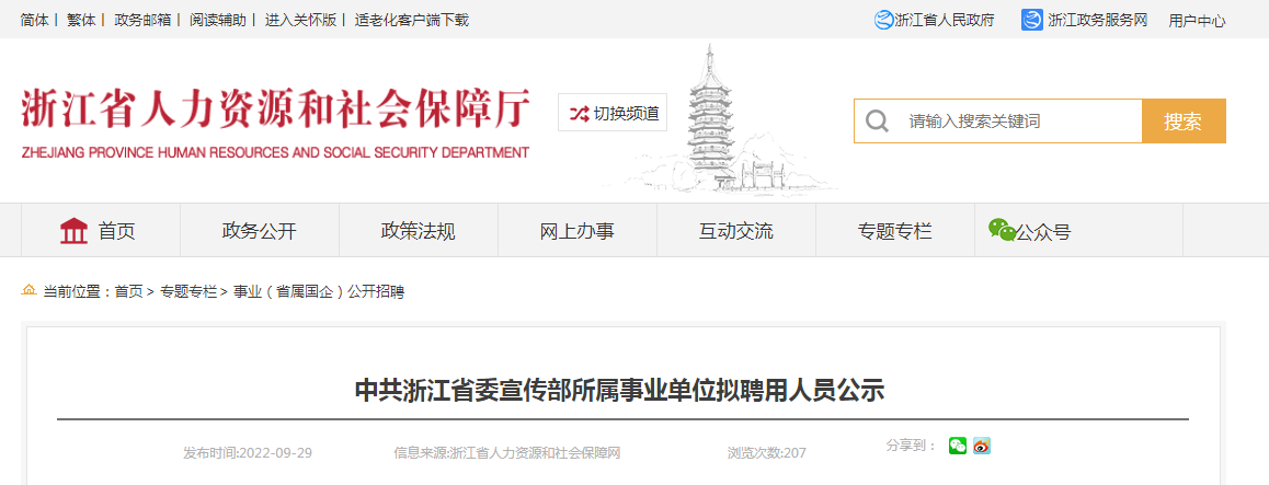 2022年中共浙江省委宣传部所属事业单位拟聘用人员公示09-30