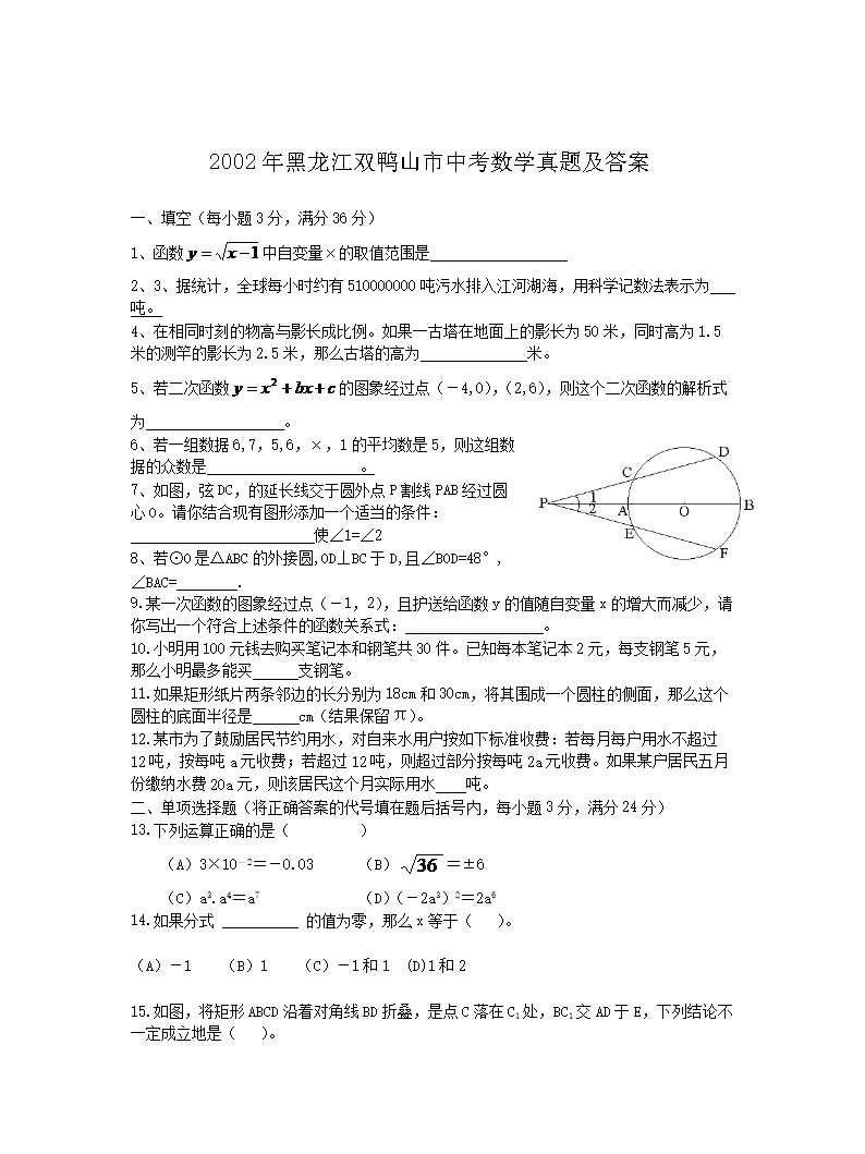 2002年黑龙江双鸭山市中考数学真题及答案(Word版)06-01