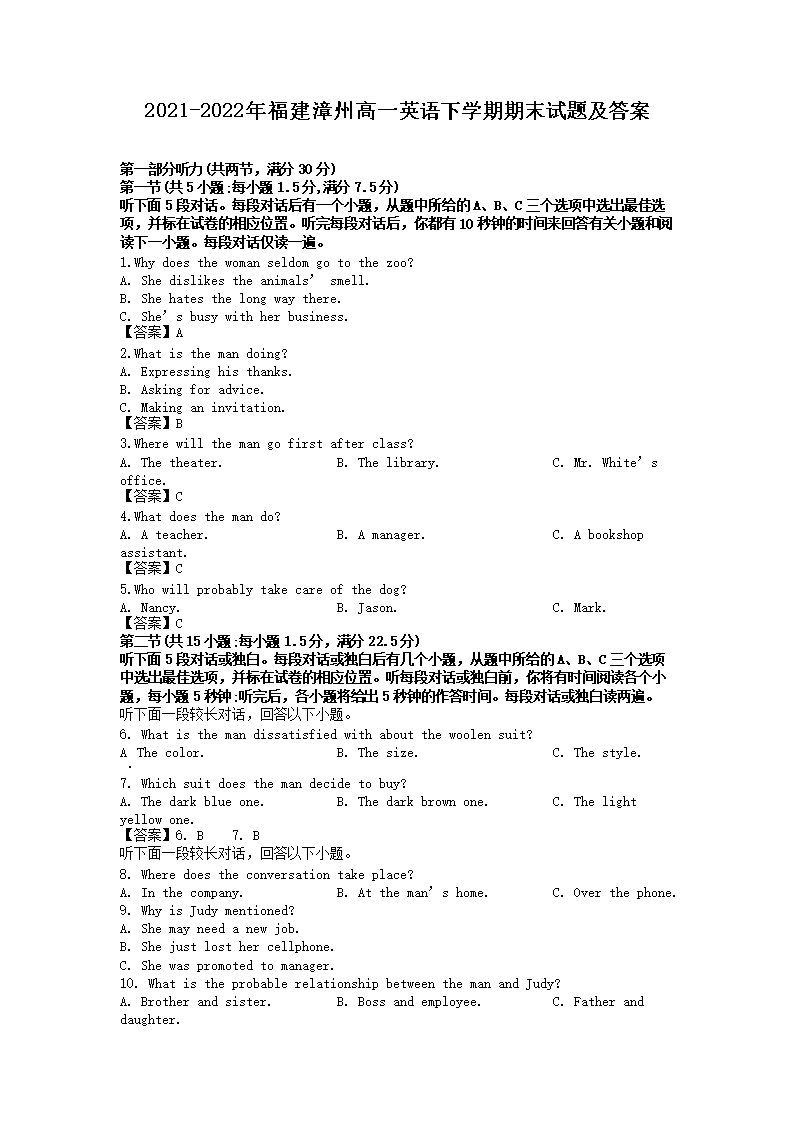 2021-2022年福建漳州高一英语下学期期末试题及答案(Word版)09-23