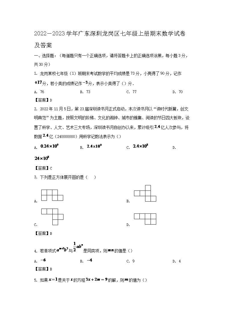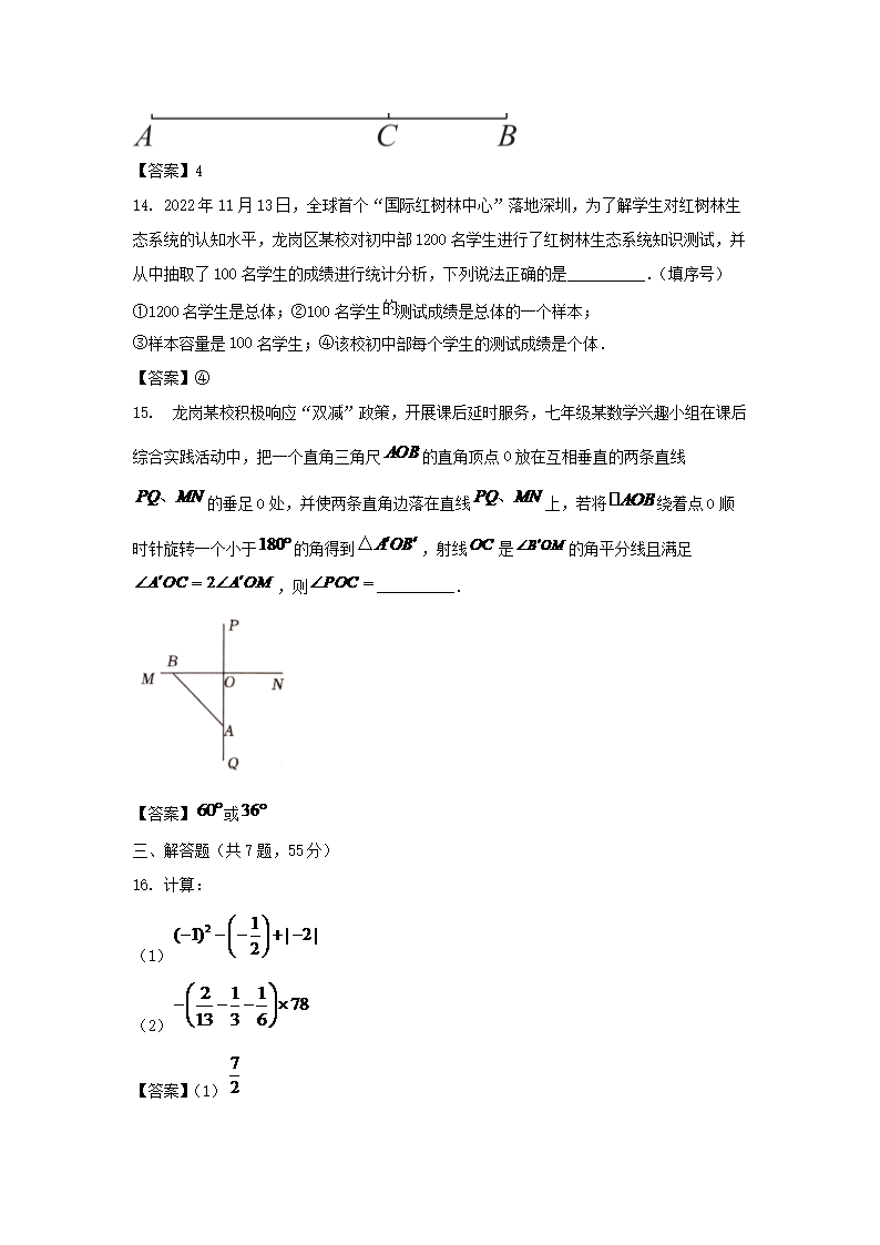 2022-2023学年广东深圳龙岗区七年级上册期末数学试卷及答案(Word版)09-23