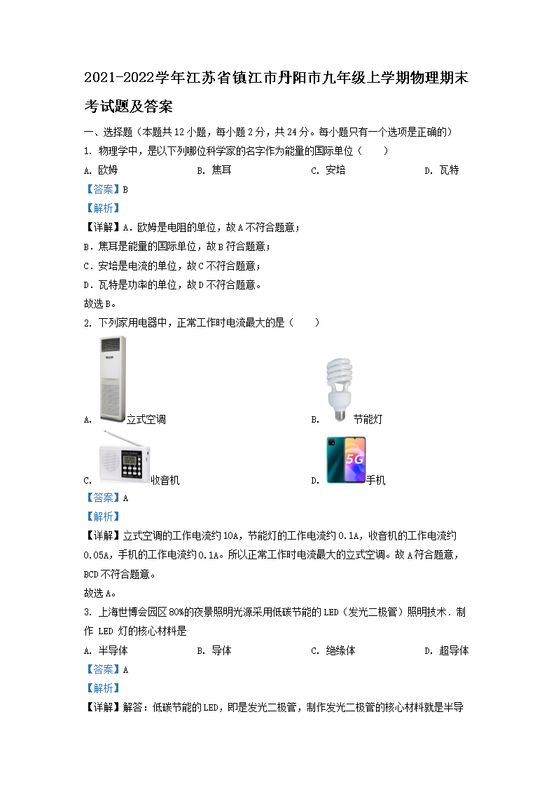 2021-2022学年江苏省镇江市丹阳市九年级上学期物理期末考试题及答案(Word版)10-11