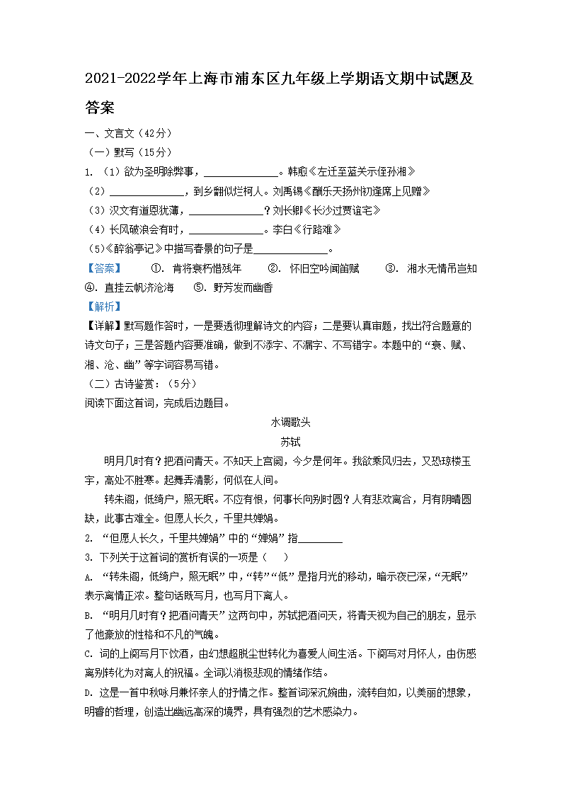 2021-2022学年上海市浦东区九年级上学期语文期中试题及答案(Word版)10-19