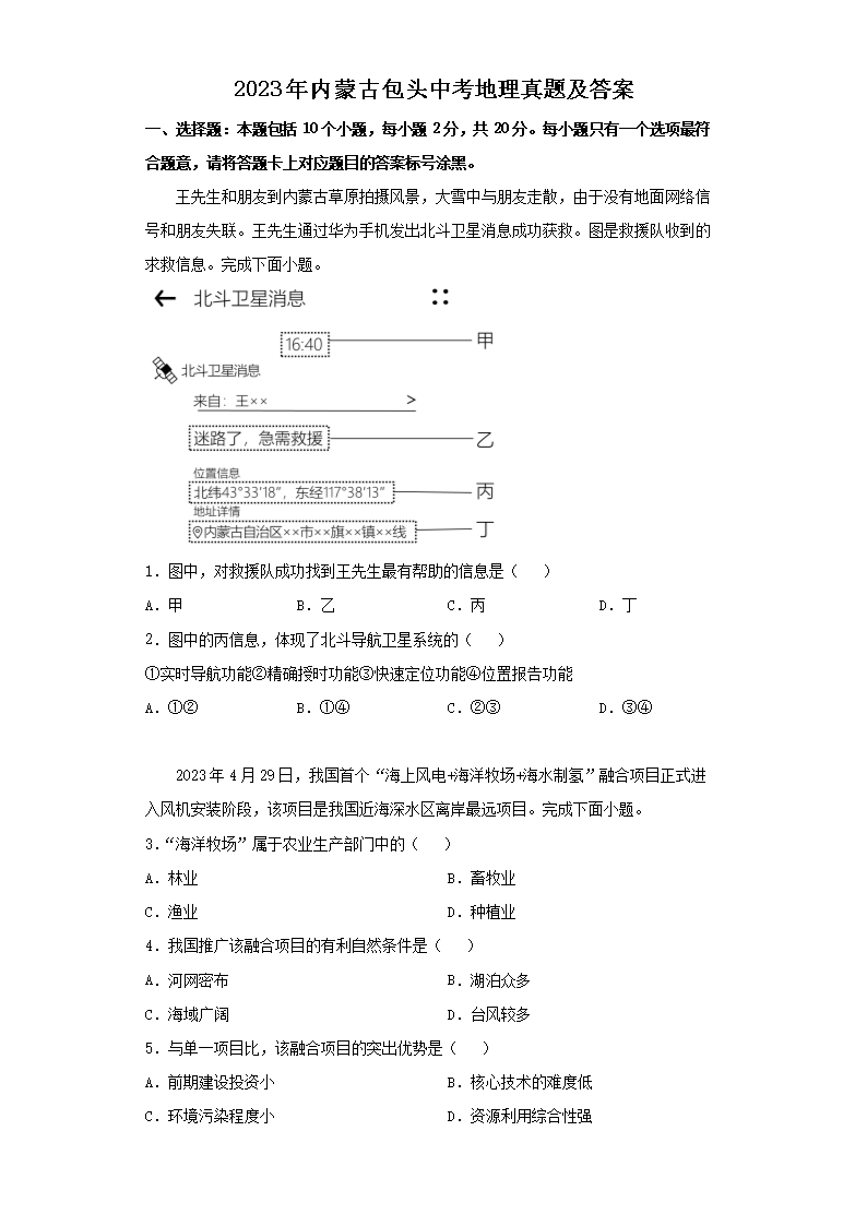 【文档预览】 文档大全网整理发布2023年内蒙古包头中考地理真题及答案(Word版),前五页预览如下: