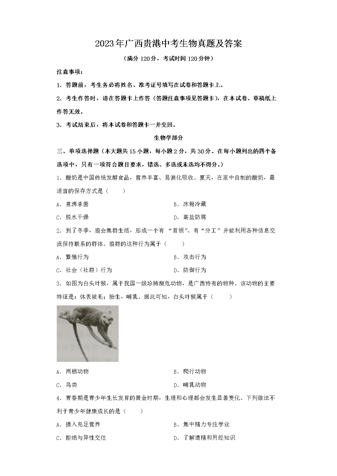 【文档预览】 文档大全网整理发布2023年广西贵港中考生物真题及答案(Word版),前五页预览如下: