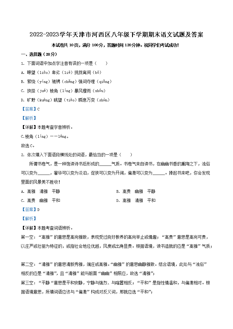 【文档预览】 文档大全网整理发布2022-2023学年天津市河西区八年级下学期期末语文试题及答案(Word版),前五页预览如下: