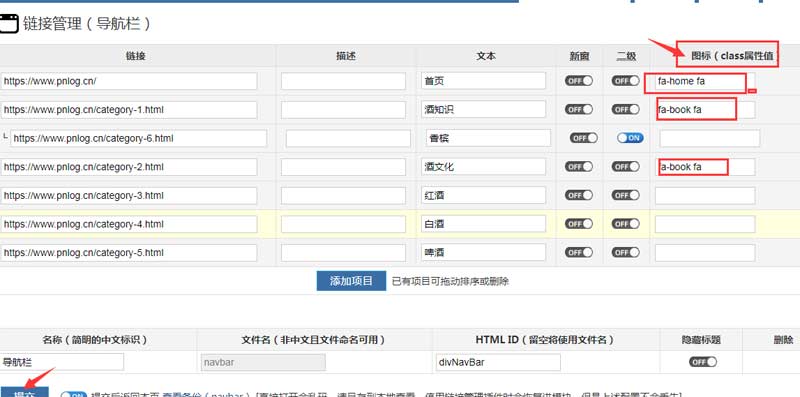 在后台--》模块管理--》链接管理(导航栏)-->图标(class属性值)里直接设置css代码就好了