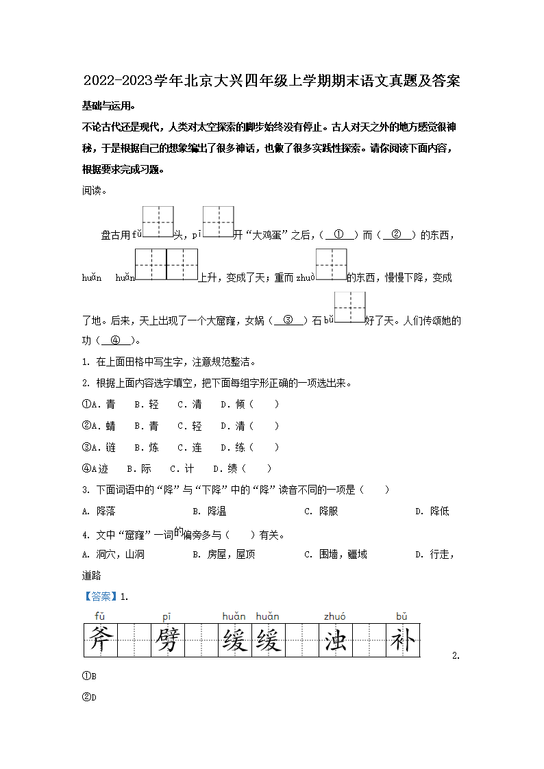 【文档预览】 文档大全网整理发布2022-2023学年北京大兴四年级上学期期末语文真题及答案(Word版),前五页预览如下: